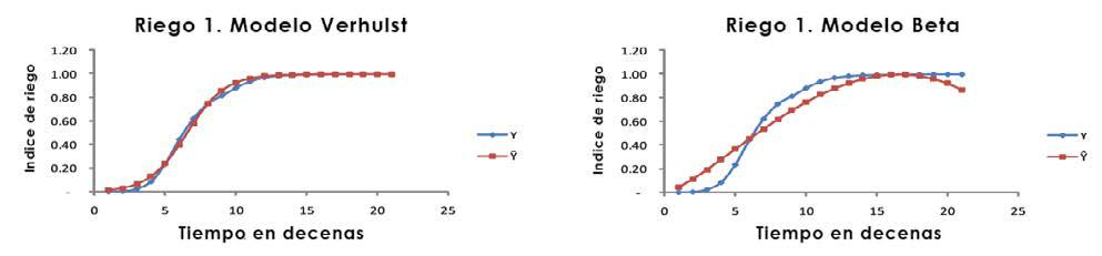 Con base en los distintos análisis expresados y resumidos en la Tabla 10, tanto el modelo Gompertz como Verhulst muestran condiciones estadísticas aceptables para ser utilizados como predictores de índices de riego, cuyos parámetros se muestran en las Tablas 4 y 5, siendo las ecuaciones: