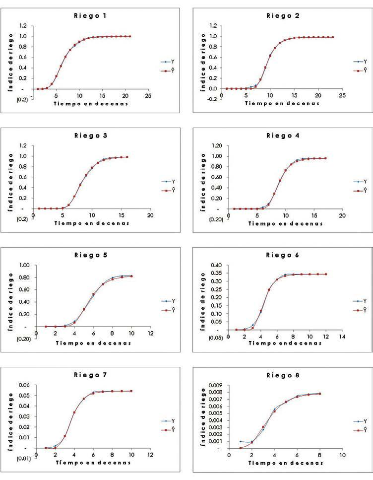 Para validar los supuestos de normalidad e independencia del modelo se realizó un examen del residual, se practicó la prueba de las rachas (run test) para comprobar la independencia de los errores; esto se muestra en la Tabla 8, en donde se describe que el modelo Gompertz presenta independencia entre errores en cuatro riegos, el de Verhulst en tres y Beta en uno.