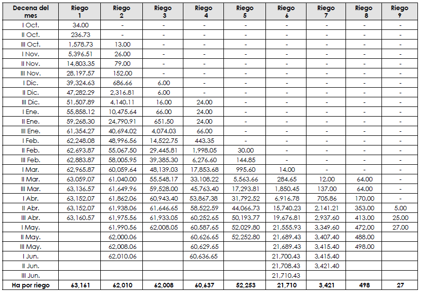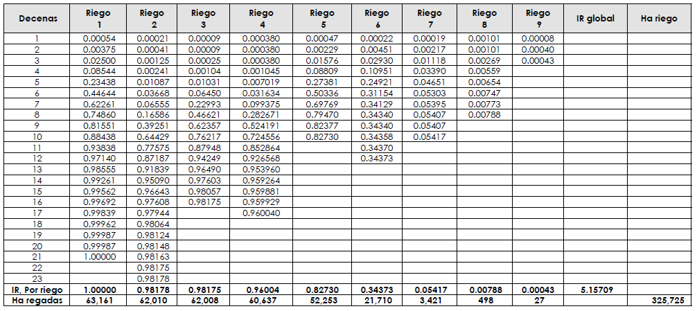 Las hectáreas de riego se refieren a la suma de las hectáreas físicas que se riegan en cada ciclo. Para el análisis del estudio los datos de las regadas acumuladas fueron expresados como fracción de superficie total establecida y se definió a dicha fracción como Índice de Riego (IR) que, para este estudio, es el valor entre 0 y 1 que representa una cantidad de hectáreas regadas en determinado tiempo, siendo IR=1 cuando se riega la superficie total establecida. La unidad de tiempo utilizada fue la decena (10 d), los índices decenales y por riego se muestran en la Tabla 2. Para efectos de cálculo de parámetros y análisis estadísticos, los riegos se inician con la Decena 1, ya que estos fueron analizados de forma independiente.