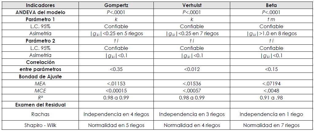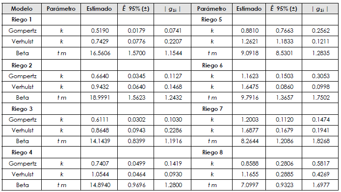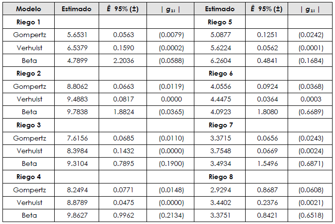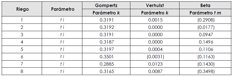 En la Tabla 5 se presentan los datos del parámetro (t i), señalan que su estimado cumple en general en los tres modelos y con todos los riegos con los límites de confianza obtenidos al 95% y la medida de asimetría fue |g₁ᵢ| < 0.1 en todos los casos de riego y modelos, lo que muestra en este parámetro un comportamiento estadístico muy cercano a un modelo lineal. De este análisis de límites de confianza y asimetría de ambos parámetros se deduce que los modelos Gompertz y Verhulst son confiables y más recomendables para obtener predicciones que el modelo Beta.