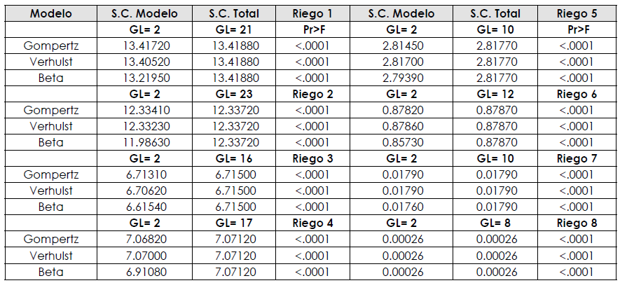 En los tres modelos se aprecia que el análisis de varianza de cada uno de ellos y en todos los riegos son altamente significativos, ya que en la fuente de variación atribuida al modelo se obtiene un valor de (P <.0001). Analizando el parámetro (k) de los modelos Gompertz y Verhulst y el parámetro (t m) del modelo Beta, en la Tabla 4, se confirma con