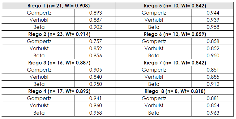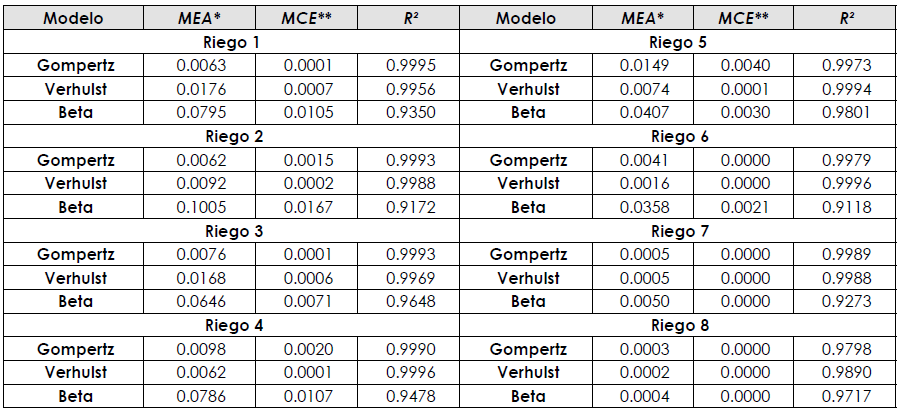 Se observa también que consistentemente este modelo presenta el menor valor de ese indicador. Para el caso de la MEA y MCE en los riegos 1, 2 y 3, se aprecia que el modelo Gompertz presenta los valores menores, lo cual es deseable; mientras que el Verhulst en los riegos 4, 5, 6 y 8 son los más bajos. En cambio, para el riego 7 se aprecia similitud en Gompertz y Verhulst. Para todos los indicadores, el Beta es el menos recomendable al comparase con los otros dos modelos. De acuerdo a este análisis, sería indistinto recomendar Gompertz o Verhulst para utilizarse como modelo de predicción en índices de riego.