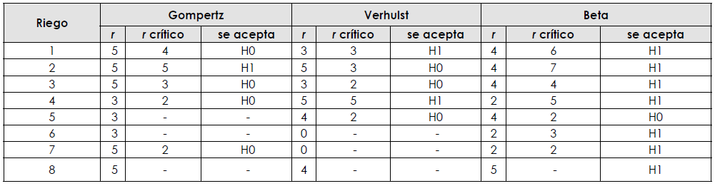 En cuanto a la verificación de normalidad con la prueba de Shapiro-Wilk presentada en la Tabla 9, indica que el modelo de Gompertz mostró características de distribución normal del residual en cinco riegos, el de Verhulst en cuatro y el Beta en siete.