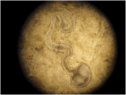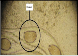 El céstodo pseudofilídeo de la especie B. acheilognathi fue encontrado en este trabajo parasitando el epitelio intestinal. Se localizó en estado maduro, tal como se muestra en la Figura 3, mientras que en la Figura 4 se muestran los huevos no embrionados del mismo; céstodo asiático, introducido, cuyo hospedero definitivo es la carpa común (C. carpio) y cuyo sitio de infección es el tracto intestinal. Este céstodo está ampliamente distribuido entre las especies nativas del altiplano mexicano. Presenta un escólex en forma de corazón y los órganos de adhesión se localizan en este. P. tomentosa se encontró en el epitelio intestinal con una FP de 83.33%. En esta investigación se localizaron hembras adultas, lo cual se visualiza en la Figura 5 y, en algunas ocasiones, fue posible observar la presencia de huevos en útero, como se muestra en