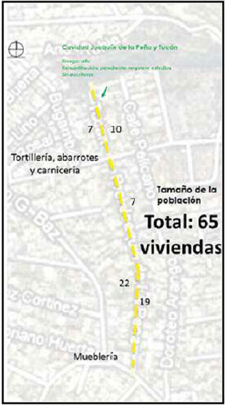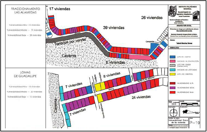 Se localizaron las casas afectadas en zonas de subsidencia minera, lo que permitió efectuar mapas para visualizar las zonas de cavernas y su rehabilitación-relleno, así como las condiciones de ocupación de vivienda que se tienen. Para realizar el análisis comparativo de la vulnerabilidad física de la construcción se hicieron gráficas que permiten visualizar los datos obtenidos, tanto del caso de la colonia Lomas de Guadalupe como del Fraccionamiento Las Alamedas. Se diseñó una cédula 1a y una cédula 1b, en donde se desglosaron los dos casos de estudio con la muestra representativa para localizar las colonias de los casos de estudio que se ven afectadas por zona de subsidencia minera. Se identificó la cavidad que afecta esta zona de subsidencia minera, donde se determinó nombre de cavidad, superficie de cavidad, así como la muestra representativa de las viviendas que se involucran en cada caso de estudio. Al tener identificadas las residencias que representan la muestra al delimitar su situación, ya sea colonia regular o irregular, así como la rehabilitación-relleno en la que se encontraban, se realizó una cédula 2a y una 2b, correspondientes a cada colonia a analizar. Así se efectuó una observación directa en la muestra que se obtuvo de cada caso. Después se localizaron las viviendas en el mapa de las cédulas, se aplicaron las cédulas 3a y 3b de cada muestra representativa del caso de estudio de las colonias analizadas. Estas cédulas permitieron medir el nivel de vulnerabilidad física en que se encuentran las viviendas ubicadas sobre cavernas subterráneas artificiales en relación con el riesgo ya establecido, así como el contexto que lo integra y sus afectaciones al estar sobre zonas de subsidencia minera. Para ello se efectuó observación de campo y se registraron los parámetros determinados, así como los daños en grietas que permiten establecer el hundimiento presentado por medio de croquis, con observación directa y fotografía de la casa. Se estableció el análisis de la vulnerabilidad física de las viviendas que se encuentran afectadas por subsidencia minera, en un tiempo y espacio real determinado por la muestra. Para poder determinar la vulnerabilidad física de la vivienda, se consideró a Municipio de Atizapán de Zaragoza, Protección Civil (2009); Saeidi et al. (2009); Ayuntamiento de Atizapán de Zaragoza (2009) y Can et al. (2012), que permitieron determinar por medio de una valoración el nivel de vulnerabilidad física que tiene la vivienda que está ubicada sobre cavernas subterráneas artificiales. Por ello, entre mayores sean las características de la residencia y el techo de la caverna sea menor a la superficie donde está ubicada aquella el hundimiento es mayor, con grietas en la vivienda que son determinadas por la subsidencia minera.