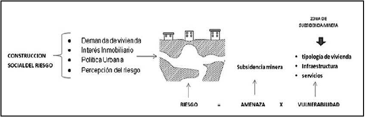Se pretende demostrar y comprobar que el riesgo de los inmuebles ubicados sobre cavernas subterráneas artificiales se construye socialmente en relación con la vulnerabilidad, a partir de la demanda de vivienda, de la política urbana, de los intereses inmobiliarios y de la percepción de riesgo de los habitantes. Para ello, se debe comprender el proceso histórico de interacción de factores involucrados para la ubicación de residencias en zonas de subsidencia minera, en conjunto con la percepción de la población que está directamente afectada, ya que la construcción social del riesgo radica en la creación y la percepción del mismo, bajo una amenaza latente.
