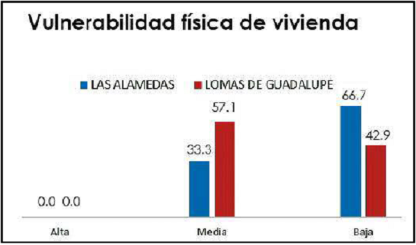 Se refleja la vulnerabilidad física de la casa en donde la colonia irregular cuenta con una mayoría de vulnerabilidad media de 57.10%, mientras que en la colonia de fraccionamiento es una baja de 66.7%; lo que hace notar que la colonia popular es la que cuenta con menor capacidad física a resistir el evento de algún colapso o derrumbe. Aunado a ello, que ambas colonias presenten la percepción del riesgo de miedo, ya tienen el conocimiento de la existencia y presencia de la amenaza y el riesgo. Con lo anterior se deja ver que la percepción del riesgo está determinada por la cultura de cada población en específico, mediante sus valores, costumbres, creencias y prácticas, que determinan la forma de percibir el riesgo en una población en tiempo y espacio real.