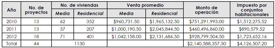 En relación con los datos que proporciona el PDU municipal 2009-2012 de vivienda media y residencial más los datos obtenidos de los conjuntos urbanos desarrollados en el periodo de 1973 a 2011 con base en el Plan de Desarrollo Urbano del Estado de México, Departamento de Supervisión 2008-2012 (SDUM, 2011); se tiene que existe una variación de 17,787 residencias ante los datos presentados por el PDU municipal 2009-2012 y los datos que muestra Desarrollo Urbano del Estado de México, Departamento de Supervisión 2008-2012, de registro de viviendas media y residencial que se encuentran en el municipio que comprende a conjuntos urbanos. Para cuantificar la actividad del mercado inmobiliario en el municipio de 2010 a 2012 se presenta la Tabla 1, en donde se muestra una producción de 44 proyectos, de los cuales se realizaron 1,130 viviendas entre media y residencial. También se presenta el desglose de los tres años para los que se tienen datos de cada número de proyectos ejecutados, así como el número de casas que corresponde a cada año y tipología, la venta promedio de cada uno, el monto de operación promedio que ejercieron las inmobiliarias en relación con las edificaciones ejecutadas y el impuesto por conjuntos habitacionales que deben haber pagado por la construcción de estos.