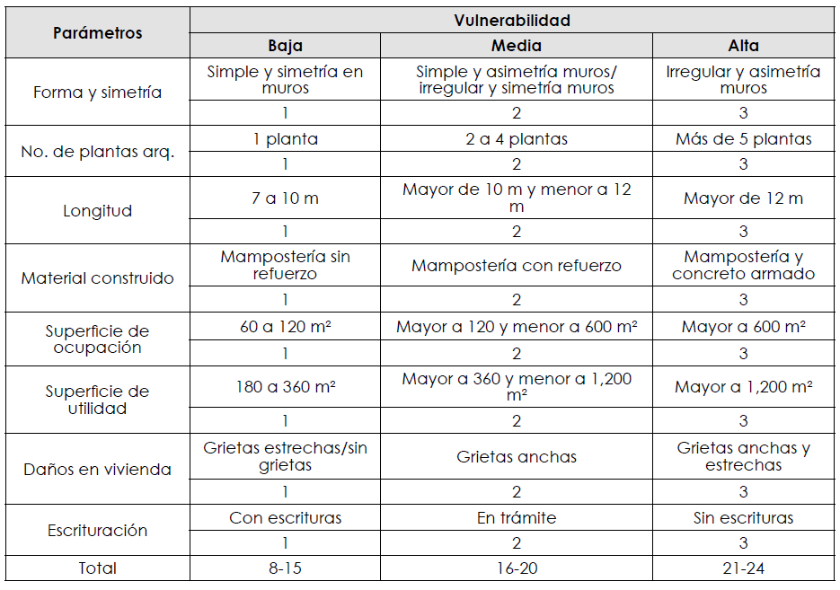 Como resultado hay tres niveles de vulnerabilidad en relación con los parámetros establecidos que comprenden la fragilidad física de la vivienda, como se muestra en la Tabla 3.