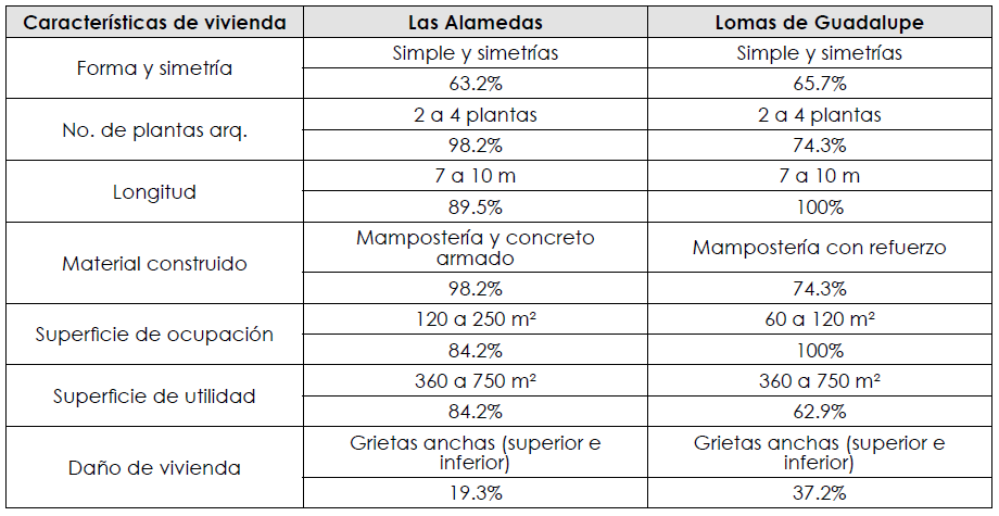 Para medir la vulnerabilidad que presentan las casas en las colonias de la muestra, la colonia Lomas de Guadalupe y Fraccionamiento Las Alamedas, se retomó la tabla diseñada con anterioridad y se obtuvo de manera general en porcentaje la condición vulnerable que tiene cada colonia.