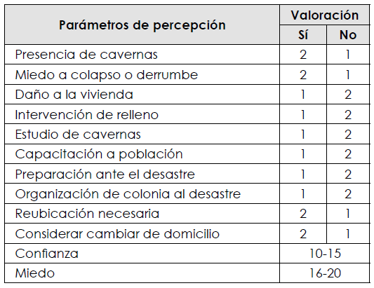 Para manejar la percepción social del riesgo se utilizaron dos indicadores principales: miedo y confianza, se formuló una encuesta que permitió medir la percepción de la población que se encuentra habitando inmuebles ubicados sobre cavernas subterráneas artificiales. Se hizo una valoración de los parámetros que determinan la percepción de riesgo que tiene una población y que da como resultado miedo o confianza, como se muestra en la siguiente tabla.