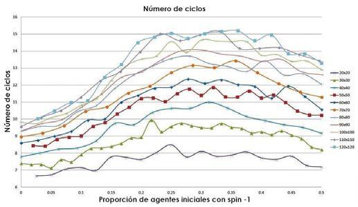 Se puede observar de este comportamiento que el número de ciclos para llegar al estado de equilibrio es proporcional al tamaño de la red. Este hecho queda reflejado en la Ecuación 3.