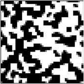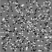 Una fase subsecuente de actualización (ciclo) con respecto a la distribución inicial se obtiene cuando son seleccionados N nodos de la red de manera aleatoria y con reemplazo; cada nodo sólo interaccionará con sus cuatro vecinos más cercanos y podrá modificar su estado de preferencia inicial de acuerdo a la preferencia mayoritaria vecinal de la fase. Por otro lado, el estado de equilibrio es alcanzado cuando ningún votante al interactuar con sus vecinos cambia de opinión, lo que permite interpretar matemáticamente el efecto del voto duro sobre el voto nulo. En la Figura 1 se da muestra de la distribución inicial en una red de 50 x 50 con el 10% de spines +1, en color negro, 10% de spines -1, en color blanco y 80% de spines neutros, en color gris.
