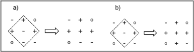 cia evita que se tenga una cinética lenta y exista un consenso (Balankin et al., 2011). Esto marca la diferencia entre nuestra regla y la regla de la mayoría relativa propuesta por Galam (1999). En la Figura 2 se muestra la diferencia entre la actualización al aplicar la regla propuesta y la regla mayoritaria sobre una red cuadrada; a) muestra la actualización en una interacción de un nodo considerando su opinión y sus cuatro vecinos más cercanos aplicando la regla propuesta y b) muestra la actualización en una interacción de un nodo aplicando la regla mayoritaria.