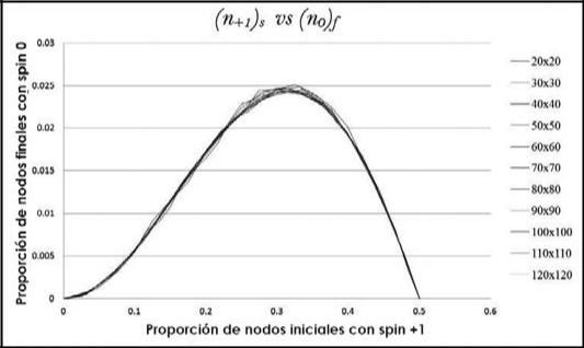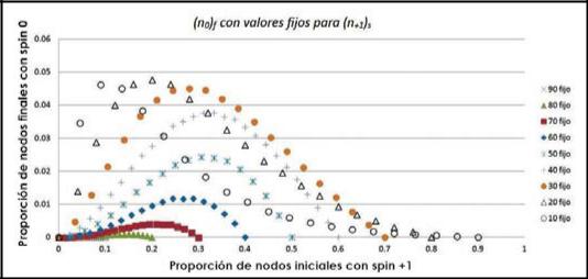 Sin embargo, se debe mencionar que el número de nodos inactivos finales cambia dependiendo de la distribución espacial inicial de los nodos con spines -1 y +1 . La Figura 6 muestra la gráfica del porcentaje final de nodos en relación con la distribución inicial de spines activos, si estos últimos se distribuyen aleatoriamente en una red de 3600 nodos. La dinámica de distribución inicial de los distintos nodos activos consistió primeramente en seleccionar un valor fijo para