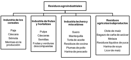 Las industrias alimentarias, granjas de giro agrícola y forestal generan grandes volúmenes de desechos, los cuales pueden ser utilizados como materia prima para los procesos de FMS. Algunos ejemplos de ellos son residuos olote de maíz, bagazo de yuca, bagazo de caña, salvado de trigo, salvado de arroz, vaina de algarroba, residuos de la industria cervecera, entre otros (Rodríguez Couto, 2008). Previo a la utilización de material en FMS es de gran importancia determinar las características microbiológicas y fisicoquímicas de los materiales a ser empleados como sustratos. Dentro de estos