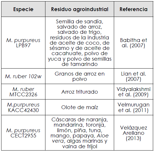 Diversos autores han reportado el uso de residuos agroindustriales para la producción de colorantes de Monascus en FMS, los cuales se describen en la Tabla 1.