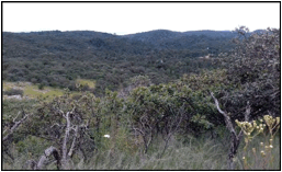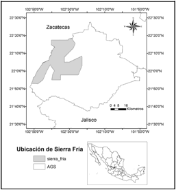 Etado de Aguascalientes, formando parte de la Sierra Madre Occidental (figura 1), en una altitud que oscila entre los 2,100 y los 3,050 m.s.n.m. (Díaz et al., 2012). Los climas predominantes son templados y semiáridos templados; su temperatura media anual varía entre 12.0 y 18.0 °C, la temperatura media del mes más frio oscila entre -3.0 y 18.0 °C y la precipitación total anual es de 600 a 800 mm. El tipo de vegetación predominante es el bosque de encino-pino, encino y encino-táscate (Juniperus deppeana). La asociación existe con pinos por arriba de los 2,450 m y táscate por debajo de esta altitud. También existe matorral templado, árido y subtropical; matorral crasicaule, espinoso, rosetófilo; chaparrales y pastizal natural. Los encinares (figura 2) son los mejor conservados con un importante número de especies (Arriaga et al., 2000).