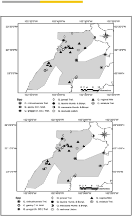 Dentro del ANP Sierra Fría se distribuyen 21 especies del género Quercus, 4 de ellas exclusivas de esta zona (tabla 1, figuras 3 y 4), las que se encuentran principalmente en bosque de encino y bosque mixto, a una altitud promedio de 2,200-2,800 m. Las especies más ampliamente distribuidas son Q. potosina y Q. eduardii. En trabajos anteriores (Díaz et al., 2012; Sosa Ramírez et al., 2011) no se tenían mencionadas 10 especies para el ANP Sierra Fría: Q. castanea Née, Q. depressipes Trel., Q. durifolia Seemen, Q. gentry C. H. Müll., Q. greggii (A.DC.) Trel., Q. laurina Humb. & Bonpl., Q. magnoliifolia Née, Q. mexicana Humb. & Bonpl., Q. repanda Humb. & Bonpl., y Q. striaturla Trel.