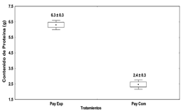 El contenido de proteína fue de 6.3% para el pay experimental por 2.4% en el comercial, lo que significa que tiene más del doble de contenido de proteína. Esto pudo deberse al tipo de fuente de origen del nutrimento; también se compararon estadísticamente y se observaron diferencias significativas (p<0.05). Esto puede encontrarse en la figura 1.