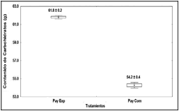 En lo que respecta al contenido de carbohidratos para el pay experimental, el valor fue de 61.8 ± 0.2 g por cada 100 g de muestra; por otra parte, la muestra comercial tuvo 54.2 ± 0.4 g. Esto