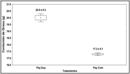 En cuanto al contenido de grasa para el pay experimental se obtuvo un valor de 20.0 ± 0.3 por cada 100 g de muestra; por el contrario, la muestra comercial tuvo 17.3 ± 0.1, esto significa que el contenido es mayor en el pay experimental; sin embargo, la grasa es vegetal y en la comercial 53.7% es grasa saturada, lo que puede ocasionar un mayor nivel de colesterol en el consumidor, al contrario del pay experimental. También se compararon estadísticamente y se observaron diferencias significativas (p<0.05), lo cual se observa en la figura 2.