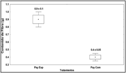 En el contenido de fibra, el pay experimental presentó 0.9% contra 0.3% del pay comercial, esto significa que es tres veces mayor. La OMS (2015) recomienda una ingesta de 25 a 35 g/d en mayores de 18 años y de 0.5/kg en menores de 10 años; por ello, este pay cubriría de 2.6 a 3.6% de los requerimientos diarios. Asimismo, se realizó una comparación estadística entre ambos preparados y se encontraron diferencias significativas (p< 0.05) en este componente. Esta información puede corroborarse en la figura 4.
