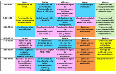 Finalmente, el curso se evaluó con la presentación frente al grupo de un metabolito generado por el propio asistente y la visualización de las características investigadas de una proteína de su interés. Al final del curso, se aplicó una encuesta anónima en línea (Survey Monkey, 2017) a cada equipo de profesores para saber su conocimiento previo del tema, opinión sobre el potencial futuro del uso de los conocimientos adquiridos y la recepción de sugerencias.