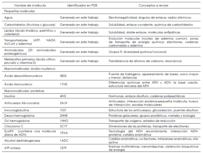 Las moléculas que se seleccionaron para el manual y curso se dividieron en tres grupos (tabla 1): el primero fue agua y metabolitos pequeños (carbohidratos, lípidos, aminoácidos y nucleótidos), el segundo ácidos nucleicos y el tercero proteínas. El grupo de ácidos nucleicos se compuso de cadenas cortas de ácido desoxirribonucleico (ADN) y ribonucleico (ARN); el ADN también se estudia como sustrato de modificación enzimática en la sección de enzimas de restricción. El grupo de proteínas se seleccionó para reflejar sus diversos papeles biológicos como hormonas, anticuerpos, transportadores y enzimas.