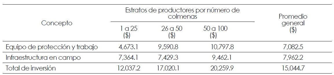 Dolores-Mijangos (2014) reportó que en la región húmeda del Istmo de Tehuantepec, Oaxaca, México, la inversión en infraestructura productiva y equipos por colmena fue en promedio 1,248.9 pesos para productores con 23 y 105 colmenas; lo cual fue similar a lo que se estimó en las comunidades mayas del Litoral Centro de Yucatán, donde el promedio general de inversión por colmena fue de 1,201.3 pesos.