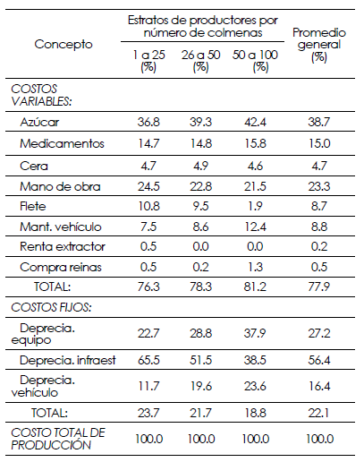 La estructura porcentual de los costos de producción se compone mayoritariamente del costo variable, cuya contribución al total asciende a 76.3% para el primer estrato, 78.3% para el segundo y 81.2% para el tercero; mientras que el costo fijo participa con 23.7%, 21.7% y 18.8% por categoría, en el orden citado anteriormente; estos porcentajes evidencian una relación inversa con la capacidad de producción o de tenencia de colmenas por productor.