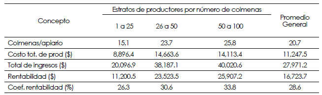 Magaña Magaña et al. (2007) encontraron que el nivel del costo de producción de 1 kg de miel evidencia una relación inversa con el número de colmenas en posesión, lo cual fue similar a lo hallado en el presente estudio, ya que para el primer estrato de productores el costo total de producción por kilogramo de miel fue de 19.7 pesos. Para el segundo fue de 16.6 pesos, mientras que para el tercero, de 14.4. La citada relación inversa obedece principalmente al uso más eficiente de los insumos y factores de la producción, así como de los activos fijos.