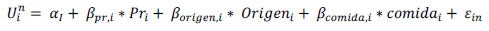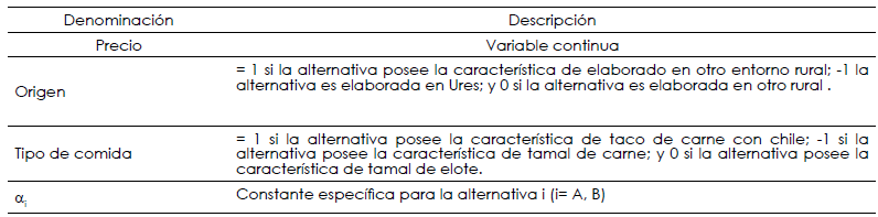 Para modelizar las preferencias del potencial turista de la ruta del río Sonora, se ha estimado un modelo logit condicional. La literatura reserva la denominación condicional para los modelos de elección discreta en que las variables explicativas son los atributos que caracterizan las alternativas de elección. En este caso, tales variables son: origen, precio y tipo de comida (tabla 2).