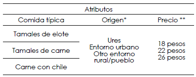 Una inspección de la oferta gastronómica en Ures y San Pedro el Saucito, tanto mediante visitas a restaurantes como a otros establecimientos de comida, así como entrevistas a consumidores, permitieron definir los niveles específicos de los atributos seleccionados para el experimento que se presentan en la tabla 1. Para mantener el experimento dentro de parámetros manejables, de las distintas cocinas típicas se designaron las tres más vendidas y mencionadas por los consumidores: tamales de carne, tamales de elote y el taco de carne con chile.