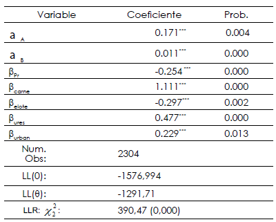 la mayoría de los alimentos se caracterizan por ser productos de demanda normal y elástica, donde las variaciones en el precio afectan sensiblemente a la demanda. En cuanto al tipo de comida, se observa que la probabilidad de comprar tamales de carne es mayor que la de comprar tamales de elote (-0.297) e incluso un taco de carne con chile (-0.814). El coeficiente del nivel excluido como variable se puede obtener cambiando el signo de la suma de los coeficientes de los niveles presentes (p. ej. βtaco= -βcarne + βelote).