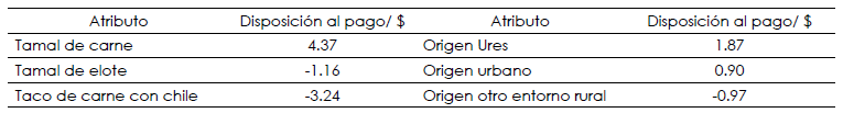 En este caso, los resultados indican que por tipo de comida los consumidores estarían dispuestos a pagar un sobreprecio de hasta 4.37 pesos por un tamal de carne, pero que en el caso de los tamales de elote y tacos de carne con chile es necesario realizar un descuento de 1.16 pesos en el caso del primero y de 3.20 en el segundo. En el caso del origen consideran que es factible pagar un sobreprecio de 1.87 pesos cuando el producto procede de Ures, de 0.90 si es elaborado en un entorno urbano, pero en el caso de tener origen en otro entorno rural que no sea Ures es necesario compensarles con un descuento de 0.97 pesos (tabla 4).
