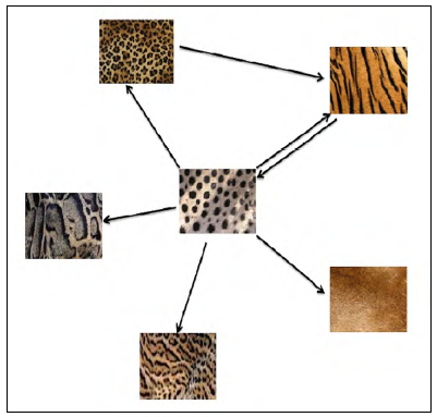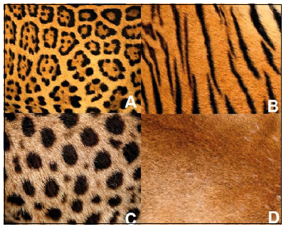 Las especies con manchas (e.g. jaguar −Panthera onca−, ocelote −Leopardus pardalis−) (figura 6) están asociadas a una locomoción arbórea, viven en hábitats cerrados y su alimentación está basada principalmente en ungulados; las motas los ocultan entre las sombras de la selva al interrumpir el contorno de sus cuerpos (Ceballos, 2010; Sunquist, & Sunquist, 2002). Las especies con rayas verticales se asocian a una locomoción terrestre y habitan principalmente en pastizales (Caro, 2005; Stankowich, & Coss, 2007), por ejemplo, el tigre (Panthera tigris), que usa las rayas como camuflaje para esconderse de su presa y pasa desapercibido en la vegetación iluminada por los rayos de luz que lo manchan de grandes sombras irregulares (Valvert-López, 2008). Hay felinos que viven en las montañas y tienen el pelaje de color claro o grisáceo como el leopardo de las nieves (Panthera uncia) (Sunquist, & Sunquist, 2002), que se alimenta principalmente de aves y de carnívoros medianos y pequeños (Lyngdoh et al., 2014).