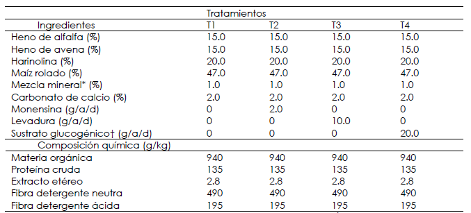 Los suplementos utilizados en los tratamientos experimentales fueron monensina, levadura y un sustrato glucogénico. La levadura utilizada está conformada por una mezcla de Saccharomycescerevisiae y oligosacáridos. Por otro lado, el sustrato glucogénico está compuesto por una mezcla de propionatos (3.3% de propano-1,2-diol; 6.9% de propionato de calcio; c.f.p. excipiente). Los animales fueron alimentados con cuatro dietas experimentales (tabla 1) dos veces al día (9:00 y 15:00 h), mientras que los rechazos fueron pesados diariamente. El consumo de materia seca se restringió a 2.2% del peso vivo de los animales de acuerdo con lo recomendado por Zinn (2000).