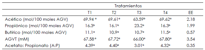ab Medias con literal diferente en la misma fila son diferentes (P>0.05); AGVT: ácidos grasos volátiles totales; EE: error estandar de la media.