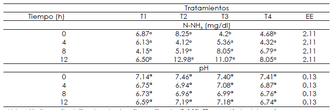 T3 y T4, respectivamente (P<0.05). En contraste, no se observaron diferencias en el pH entre tratamientos (P>0.05).
