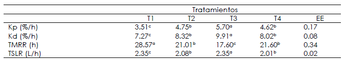 Por otra parte, la tabla 4 muestra los parámetros de cinética ruminal. La tasa de pasaje (Kp), la tasa de digestión (Kd) y el tiempo medio de retención ruminal fueron diferentes entre tratamientos (P<0.05), además la adición de levadura y sustrato glucogénico incrementaron la Kp y Kd, mientras que TMRR disminuyó.