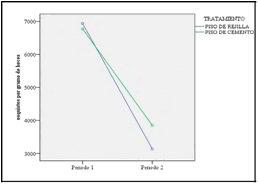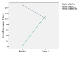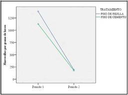 Con respecto a los céstodos, no existió diferencia entre los periodos (p >0.05), aunque se aprecia un incremento en el grupo de corderos colocados en piso de concreto y una disminución en los corderos colocados en piso de rejilla (figura 3).