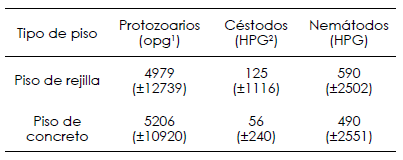 La falta de diferencia estadística entre el grupo de rejilla y el de concreto, en cuanto al número de huevecillos/ooquistes de protozoarios, céstodos y nemátodos, pudo deberse al hecho de que los corrales de piso de cemento recibían una limpieza diaria, lo que disminuía la exposición de los corderos a las formas infectantes de los parásitos.
