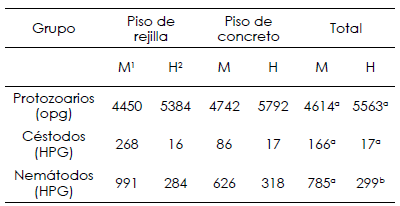 La interacción tipo de piso * sexo tampoco arrojó diferencias estadísticas (p >0.05) en el número de huevecillos/ooquistes. Sin embargo, el número de nemátodos (sin importar el tipo de piso) fue mayor en machos que en hembras (p <0.05), mientras que los protozooarios y los céstodos no mostraron diferencia (p >0.05) (tabla 2).