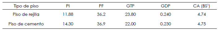 La tabla 3 presenta los resultados de las variables de peso inicial, peso final, ganancia total de peso, ganancia de peso diaria y conversión alimenticia. En ninguna variable productiva se observó diferencia (p >0.05) entre los corderos en piso de concreto y piso de rejilla, aunque los corderos estabulados en piso de rejilla iniciaron con un peso 20% menor que los estabulados en piso de concreto.