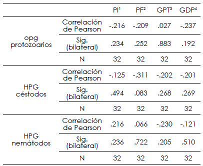 mostró diferencia estadística significativa (p >0.05), aunque la ganancia diaria de peso se correlaciona negativamente con el número de huevecillos/ooquistes de coccidia, céstodos y nemátodos (tabla 4).