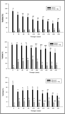 Por otro lado, después de una hora de almacenamiento en NL se observó que los valores de viabilidad se mantuvieron constantes y bajos, indicando que ninguno de los tiempos de contacto con PVS2 fue adecuado para brindar protección a las yemas y, por tanto, mantener su viabilidad celular. Estos resultados son similares a lo reportado por Wang et al. (2014), donde observaron que la solución de PVS2 causó mayor daño en los ápices de papa, dando como resultado más tiempo de recuperación y baja regeneración de los tejidos después estar en NL; así como lo reportado en brotes adventicios de Paraisometrum mileense, donde el tratamiento con PVS2 afectó considerablemente la regeneración y se obtuvo un óptimo de sobrevivencia a los 90 min (Lin, Yuan, Wang, & Li, 2014).