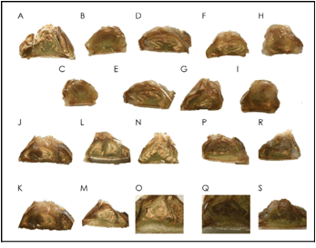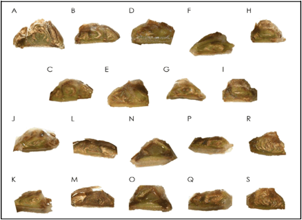 Las imágenes del corte longitudinal de las yemas expuestas a PVS2 y crioconservadas se muestran en la figura 2. Se observó un ligero oscurecimiento en los tejidos después de 30 min de contacto con la solución crioprotectora PVS2 (figura 2 [A]). De igual forma, se detectó un incremento en el daño (enturbiamiento del tejido meristemático) de las yemas conforme aumenta el tiempo de incubación. Por otra parte, en las imágenes después de PVS2 y una hora en NL (figura 2 [C, E, G I, K, M, O, Q y S]) aumentó el oscurecimiento o afectación en las yemas, se expresa con mayor intensidad en tiempos de mayor exposición (300 y 420 min) (figura 2 [Q y S]). Este comportamiento concuerda con los bajos niveles (<10%) de viabilidad observados en las yemas expuestas a PVS2 y una hora en NL (figura 1 [A]).
