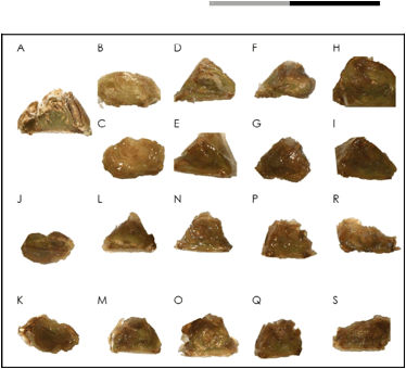 En las imágenes de las yemas sometidas a PVS3 y crioconservadas mostradas en la figura 3 se detectó un menor daño en los tejidos después de la incubación con PVS3 (figura 3 [B, D, F y H]) con respecto al tiempo inicial (figura 3 [A]), solamente al tiempo máximo de exposición de 420 min (figura 3 [R]) se encontró un ligero oscurecimiento en la parte superior de la yema (figura 1 [B]). En las imágenes de las yemas en PVS3 y NL (Figura 3 [C, E, G, I, K, M, O, Q y S]) se observó que mantienen las características similares a las yemas sin NL y el control. Mayores daños se detectaron en los tejidos después de 210 min de incubación en PVS3 y NL (Figura 3 [M, O, Q y S]) y precisamente estos tejidos presentaron menor viabilidad (10-15%) (figura 1 [B]). De acuerdo con esto, se considera un rango de tiempo óptimo de incubación entre los 90-120 min en PVS3, que fue donde se obtuvo mayor viabilidad (35%) después de NL. Además, las yemas no mostraron oscurecimiento (figura 3 [G e I]), lo cual indica que este tiempo de incubación con la solución PVS3 puede ser el adecuado para la crioconservación de yemas axilares de vid.