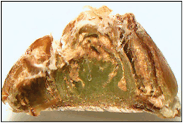 Se observó también un incremento en el daño (oscurecimiento de tejido meristemático) de las yemas conforme aumentaba el tiempo de incubación. Lo anterior puede deberse a que el etilenglicol y el DMSO, componentes de la solución PCS2, moléculas permeables, puede inducir permeabilidad a la membrana e incrementar la difusión del glicerol. El incremento intracelular que se lleva a a cabo pudiera provocar un efecto dañino a las células en el lugar de una crioprotección (Volk, Harris, & Rotindo, 2006, p. 305). En este sentido, se reportó en brotes de Mentha x piperita L. cv Todd Mitchman Pepermint (PI 557973) expuestos a soluciones de crioprotectores (PVS2 y PVS3), que la solución PVS2 fue más dañina que PVS3 para la sobrevivencia de los tejidos y este efecto fue atribuido al glicerol presente en la solución en combinación con los otros crioprotectores, como el DMSO y etilenglicol (Volk et al., 2006). También el tiempo de exposición es clave para el mantenimiento de la integridad celular. Ganino et al. (2012) detectaron la presencia de células plasmolizadas en tejidos de Vitis Berlandieri x V. riparia desde los primeros 30 min de exposición a PVS2. Un corte transversal de yema axilar de vid se muestra en la figura 5.